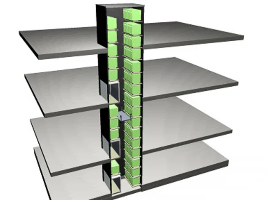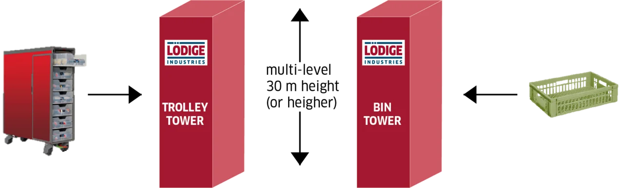 Depending on configuration, a single tower can store up to 250 trolleys or 1,000 bins.