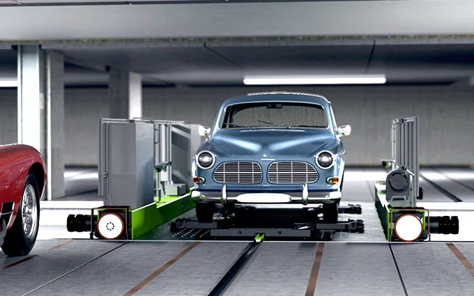 In the fully automated facility, cars will be parked in one of the access cabins from where they will be transported into the system by a flat robot carrying them by their tyres onto a transport vehicle and from there onto the parking space.