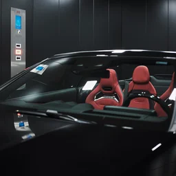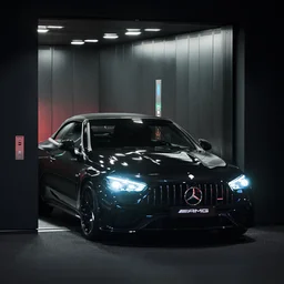 This car lift is a key component of the internal logistics, combining cutting-edge technology with the powerful visual identity of the AMG brand. The dark, fully powder-coated finish in RAL 7021 emphasizes the premium character of the facility and blends seamlessly into the overall architectural concept.