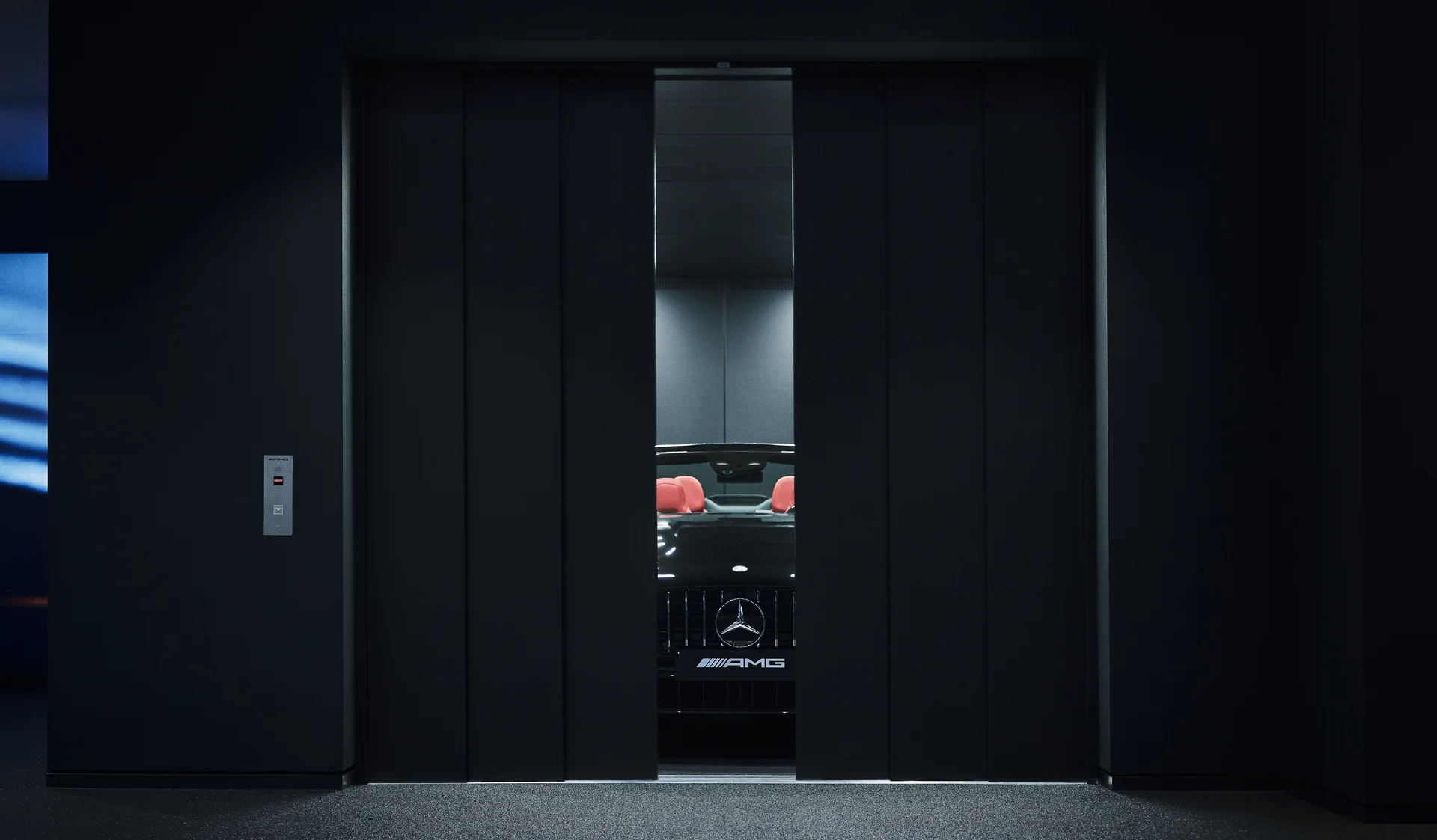 The CARRICO car lift ensures efficient, safe, and elegant vehicle movement between the different levels of the AMG Brand Center. Its generous cabin dimensions are optimized for sports cars and high-performance vehicles. At the same time, its robust construction meets the specific requirements of a brand and service environment where vehicles are not only showcased but also moved, stored, and maintained.