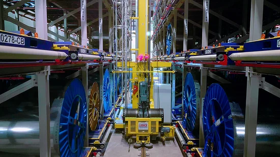 As the available storage area of 800 m² is not extendable, a multi-storey solution was required to meet the growing demand. At the same time, the cable drums, weighing in at 5.3 tons each are susceptible to damage if stored incorrectly. Retrieval and stock tracking posed an additional challenge. The new fully automated 4-level system serviced by an ETV enables the customer to store significantly more stock on the same footprint in a safe and damage-free manner. Up to 293 storage positions can now be managed in the warehouse.