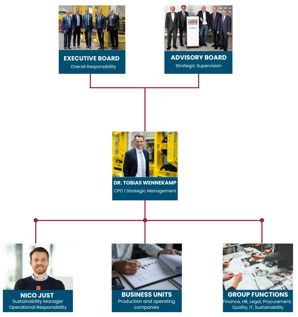 La începutul anului 2023, Lödige Industries a înființat un departament de durabilitate sub responsabilitatea lui Nico Just pentru a promova în mod activ dezvoltarea și punerea în aplicare la nivel de grup a unei strategii de durabilitate. Departamentul de durabilitate este în contact strâns și regulat cu departamentele relevante și raportează direct conducerii superioare. Din aprilie 2025, Viola Toews Reimer sprijină echipa noastră în calitate de student care lucrează în domeniul comunicării privind durabilitatea. Pe lângă integrarea sistematică a sustenabilității în procesele, produsele și activitatea noastră de zi cu zi, suntem, de asemenea, dedicați stabilirii raportării sustenabilității la nivel de grup pentru a promova transparența și gestionarea direcționată a măsurilor legate de sustenabilitate.